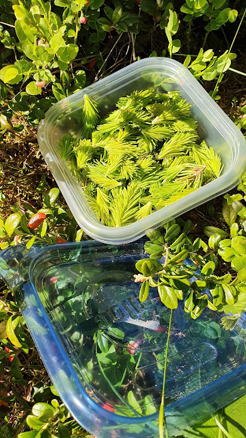 Sedan är det förstås dags för skörd också. Granskott, denna rikliga c-vitaminkälla, som även kryddar en del maträtter med både färg och friskhet, måste skördas i rättan tid.